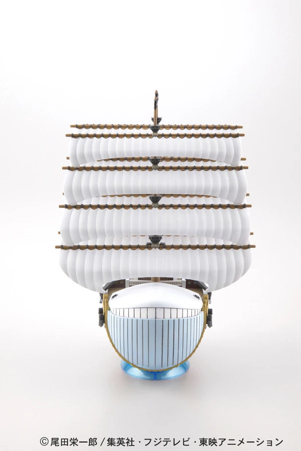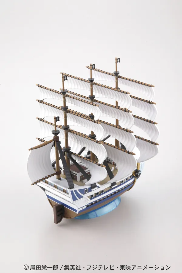 Reproduction fidèle du navire mythique de One Piece : coque, voiles, configuration inspirée de l’apparition dans l’arc Marineford.